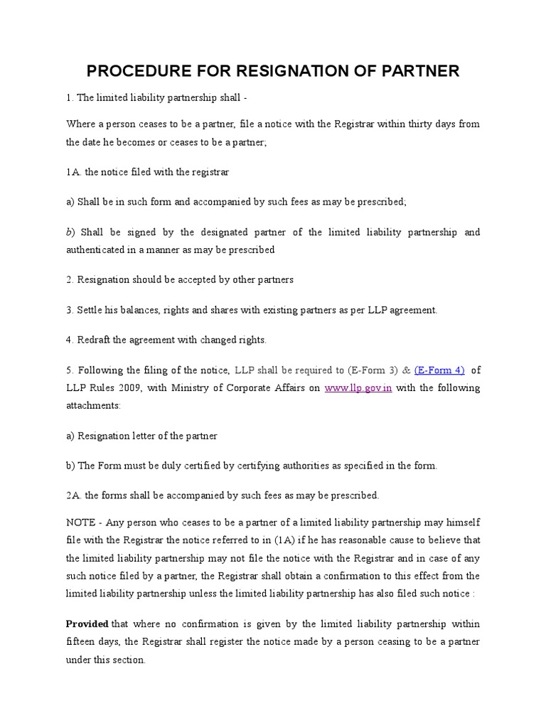 Llp Partner Resignation Letter Format. 2 Designated Partner and 2 Partners in Chatura IT Solutions LLP. Resignation as Designated Partner from LLP. A designated partner of a Limited Liability Partnership LLP company who wants to resign from his position in LLP should write a resignation letter only in the format prescribed under the law ie.